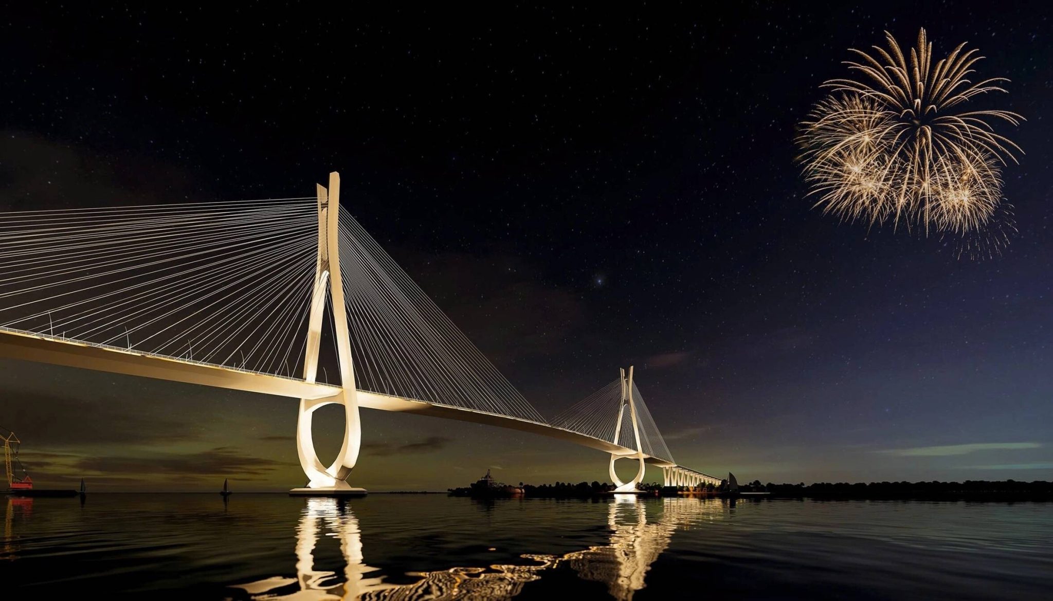 Hệ thống chiếu sáng giúp cầu Cát Lái rực sáng trong đêm với điểm nhấn là hai trụ tháp.