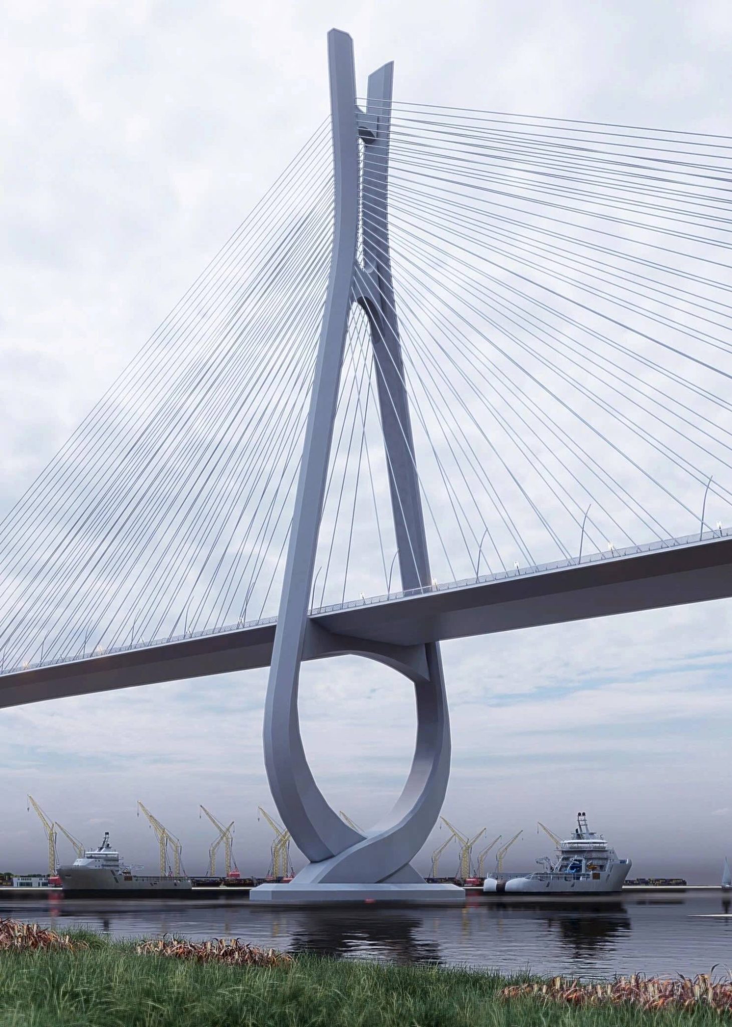 Cầu Cát Lái mang dáng uốn lượn của dòng sông, điểm nhấn là hai trụ tháp khỏe khoắn, mềm mại, biểu trưng cho sức sống và khát vọng phát triển.